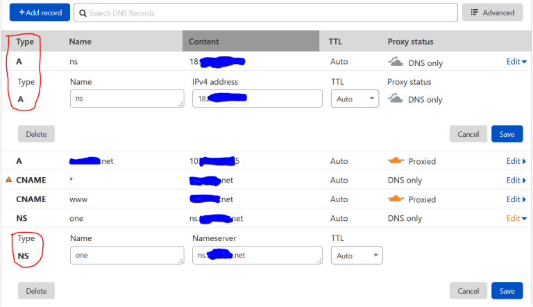 Create an A record to specify the address and the name for the rogue DNS server. E.g., ns.mydomain.net and any externally routed IP address you get with an Amazon instance or VPS. This is what my Cloudflare panel looks like. You add the two records circled in red, and the NS record below tells that name server (Cloudflare in this case) that ns.mydomain.net is the authoritative name server for one.mydomain.net. However, as you can see from the other A and CNAME records, one.mydomain.net is not assigned to an IP or otherwise.